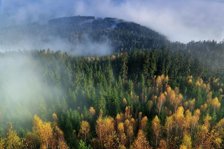Keywords: autumn mountains the fog forest nature landscape view top view rocks tree the prospect of clouds in the morning