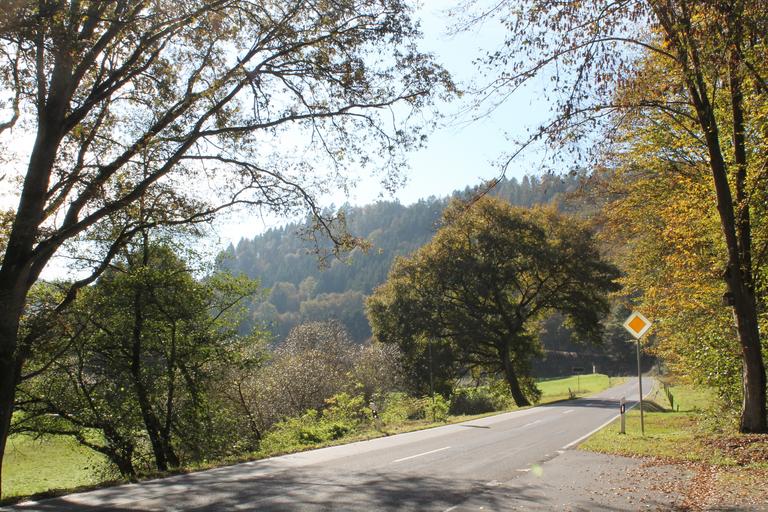 Keywords: autumn road trees avenue driving a car leaves germany sunny main road green recovery october shadow sun nature rest forest out sky landscape