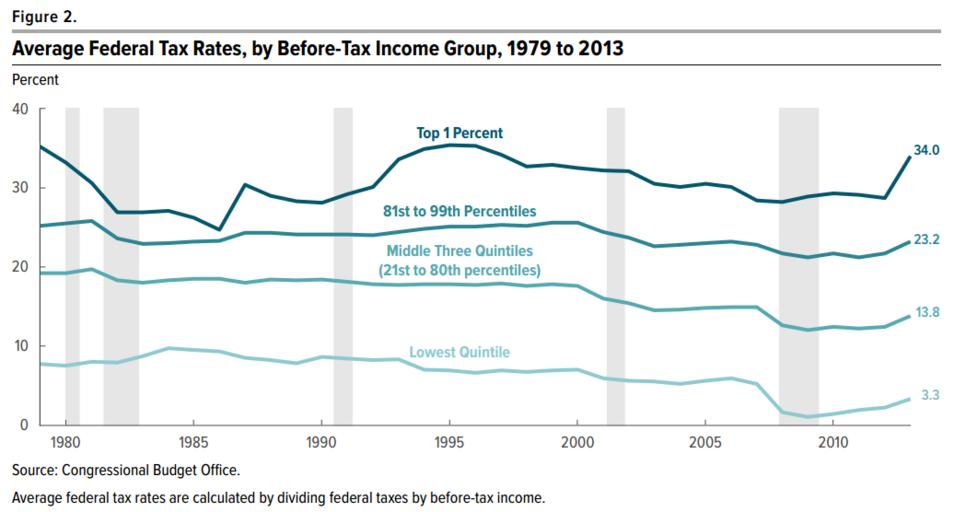 Keywords: Average US Federal Tax Rates 1979 to 2013.png Understanding the chart President Obama's tax increases on the highest income taxpayers raised their effective tax rates for 2013 There were two primary increases Expiration of the Bush tax cuts of 2001 and 2003 for the top 1 of taxpayers income over 400 000 or 450 000 for married filing tax returns jointly Payroll tax increases on incomes over 200 000 roughly the top 5 as part of the Affordable Care Act Obamacare Uploaded with en wp UW marker 2014 01 06 December 2013 Chart from the US Congressional Budget Office depicting tax rates by income group from 1979 to 2010 and implications for tax rates based on 2013 law https //www cbo gov/publication/51361; prior version at http //cbo gov/publication/44604 2013-12-04 US Congressional Budget Office publication 44604 Taxes PD-USGov |