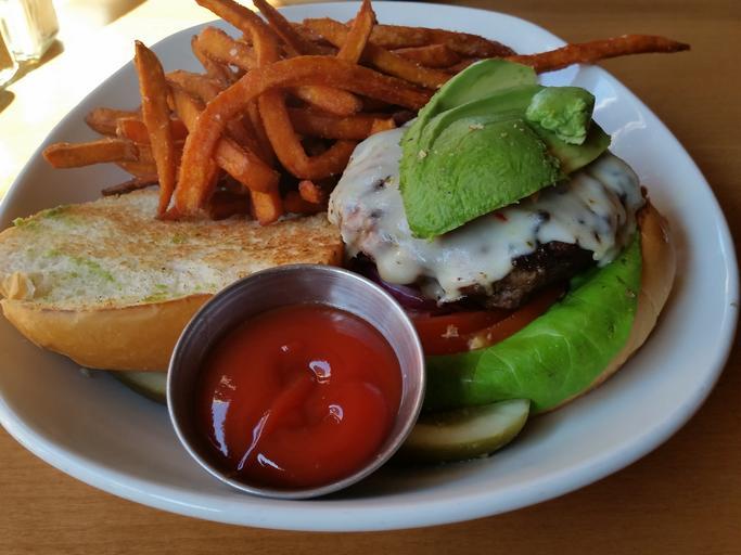 Keywords: avocado cheeseburger sweet potato fries tomato red onion ketchup orange slice dill pickle wedge