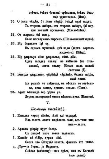 | Keywords: Azerbaijani proverbs 51.jpg en Page with Azerbaijani proverbs and riddles written by Alexander Kalashev from the words of Rza Miriyev inhabitant of Khatynbulag village Jabrayil uyezd Yelizavetpol guberniya Сбо ник мате иалов для описания местностей и племен Кавказа Выпуск восемнадцатый Отдел II Ст 51 Azerbaijani proverbs and riddles written by Alexander Kalashev from the words of Rza Miriyev 1894 PD-old Azerbaijani proverbs Azerbaijani manuscripts | ||||