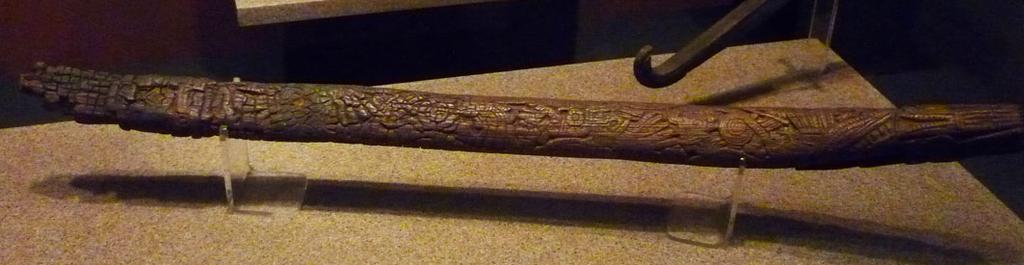 Keywords: Aztec atl-atl (Museo Nacional de Antropología).jpg An atlatl or spear-thrower is a tool that uses leverage to achieve greater velocity in dart-throwing and includes a bearing surface which allows the user to temporarily store energy during the throw It consists of a shaft with a cup or a spur which may be integrated into the weapon or made separately and attached in which the butt of the projectile properly called a dart rests The atlatl is held in one hand gripped near the end farthest from the cup The dart is thrown by the action of the upper arm and wrist in combination with the atlatl as an extension of the throwing arm adding significant force through increased angular momentum Common dog ball-throwers molded plastic shafts used for throwing tennis balls for dogs to fetch use the same principles and in effect are a type of atlatl A traditional atlatl is a long-range weapon and can readily achieve speeds of over 150 km/h 93 mph en wikipedia 2007-02-11 Fsunoles talk Uploads Maunus Original upload log en wikipedia Aztec+atl-atl+ 28Museo+Nacional+de+Antropolog C3 ADa 29 jpg wikitable - 2010-09-11 21 54 1063×275× 69333 bytes Maunus Aztec Atlatl - spearthrower - the only one in existence - exhibited at the Museo Nacional de Antropología e Historia México I ~~~ created this work entirely by myself ~~~~~ Au Uncategorized 2016 May 6 |