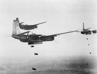 | Keywords: B-26s bombing Korea 18Oct1951.jpg  Title USAF Douglas B-26 Invaders bombing a target in North Korea 18 October 1951 <br> Original caption U S Air Force B-26 Invader light bombers release quarter ton demolition bombs in a strike over North Korea The B-26 has been in action against the North Korean and Chinese Communist forces since the out break of Korean hostilities ca 18 October 1951 U S National Archive photo ARC Identifier 542237 Local Identifier 342-AF-80936AC http //arcweb archives gov/arc/digital_detail_summary jsp tn 542223 nw y rn 11 nh 15 st b rp summary si 0 1951-10-18 USAF PD-USGov B-26 Invaders in the Korean War Bombing during the Korean War |