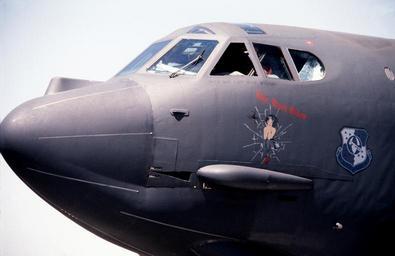 Keywords: B-52H The Black Widow Nose Art.jpeg en A view of nose art entitled The Black Widow on a 410th Bombardment Wing B-52H Stratofortress aircraft at Mountain Home Air Force Base Idaho The plane is undergoing a preflight check prior to taking part in exercise Mighty Warrior '88 1988-08-11 NARA-image 6462602 SSGT Kevin Hoeth PD-USGov Nose art on B-52 |