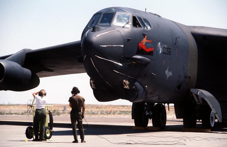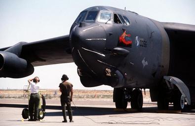 Keywords: B-52H Nemesis Nose Art.jpeg en Ground crew members stand by as a 410th Bombardment Wing B-52H Stratofortress aircraft at Mountain Home Air Force Base Idaho undergoes a preflight inspection prior to taking part in exercise Mighty Warrior '88 Nose art on the plane is entitled Nemesis 1988-08-11 NARA-image 6462603 SSGT Kevin Hoeth PD-USGov Boeing B-52H Nose art on B-52 |
