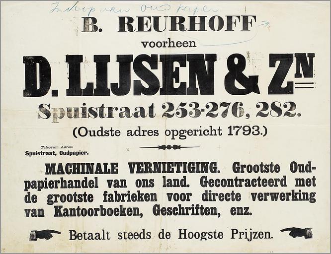 | Keywords: B. Reurhoff.jpg Affiche B Reurhoff voorheen D Lijsen Zn Spuistraat 253-276 282 Machinale vernietiging Grootste Oudpapierhandel van ons land Gecontracteerd met de grootste fabrieken voor directe verwerking van Kantoorboeken Geschriften enz Betaalt steeds de Hoogste Prijzen http //www geheugenvannederland nl/ /nl/items/RA01 8823 www geheugenvannederland nl circa 1875 1900 author anonymous-EU Paper recycling Advertising posters of the Netherlands | ||||