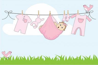 Keywords: baby girl baby girl pink cute clothes line clothes line laundry washing dangling blue sky bird birds grass clouds card template card making art illustration new born birth arrival baby shower scrapbooking