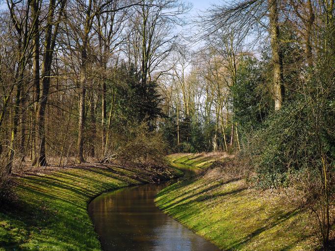 Keywords: bach forest water landscape trees nature idyllic rest flow green waters local recreation water running bank mood silent idyll water surface park düsseldorf