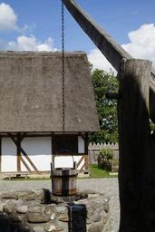 Keywords: bach ritterburg knight's castle castle lower needle middle ages wooden castle tower kanzach southern germany medieval woods building architecture reconstruction reconstructed baden württemberg germany summer fountain bucket water pick truss