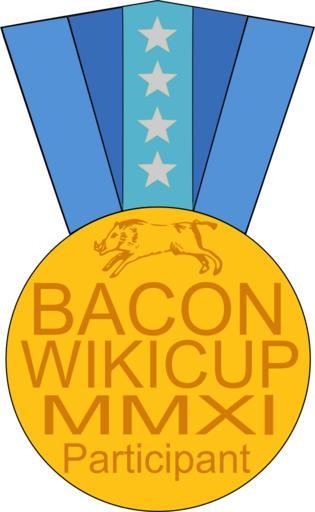 | Keywords: Bacon WikiCup 2011 Medal.svg A medal awarded to all participants in the Bacon WikiCup 2011 an event that occurred during the Bacon Challenge 2011 own / Derived from Crudeboar svg Public Domain 2011-03-29 Kevin Payravi Wikimedia Commons Inkscape 2011 medals SVG medals |