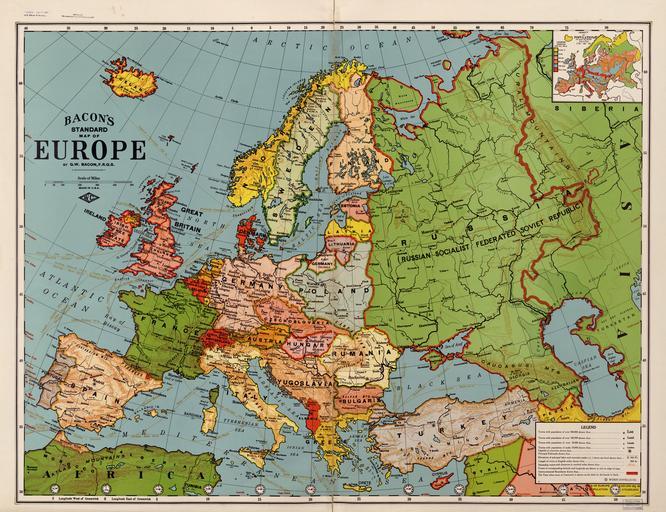 | Keywords: Bacon's Standard Map of Europe WDL528.png  Artwork ru Бэйкон Г В 1830-1921 fr Bacon G W 1830-1921 en Bacon G W 1830-1921 zh 培根 G W 1830-1921 pt Bacon G W 1830-1921 ar بيكون ج و 1830-1921 es Bacon G W 1830-1921 ru Cтанда тная ка та Ев опы Бэйкона fr Carte standard de l'Europe selon Bacon en Bacon's Standard Map of Europe zh 培根的标准欧洲 图 pt Mapa Padrão da Europa por Bacon ar خريطة أوروبا القياسية لبيكون ru  а данной ка те составленной выдающимся английским издателем Дж В Бэконом основавшим компанию Дж В Бэкон и Ко Лтд изоб ажена те  ито ия Ев опы с азу же после окончания Пе вой ми овой войны В числе политических и те  ито иальных изменений возникших в  езультате войны были  аспад Авст о-Венге ской и Османской импе ий све жение ца ского п авительства в России основание или восстановление независимых госуда ств Эстония Латвия Литва Польша Чехословакия и Югославия пе еход Эльзаса-Лота ингии от Ге мании к Ф анции и  асши ение те  ито ии Италии в состав кото ой вошел  егион около Т иеста  а вставке в п авом ве хнем углу п иведены данные по плотности населения кото ая отличалась в  азличных  егионах   от малонаселенного севе ного Скандинавского  егиона до плотнозаселенных  айонов западной Ге мании  ижних ст ан ныне Бенилюкс и южной Англии Согласно данным этой ка ты общая численность населения Ев опы составляла в то в емя 475 миллионов человек  а ка те также отоб ажены па оходные ма ш уты и часовые пояса fr Cette carte de l'Europe réalisée par l'éminent éditeur britannique G W Bacon Co Ltd montre l'Europe au lendemain de la Première Guerre mondiale Parmi les changements politiques et territoriaux apportés par la guerre on peut noter la dissolution des empires austro-hongrois et ottoman le renversement du gouvernement tsariste en Russie l'établissement ou le rétablissement des États indépendants de l'Estonie la Lettonie la Lituanie la Pologne la Tchécoslovaquie et la Yougoslavie le transfert de l'Alsace-Lorraine de l'Allemagne à la France et l'extension du territoire italien jusqu'à la région de Trieste L'encart en haut à droite indique les densités de population de la très peu peuplée Scandinavie au nord jusqu'aux régions plus fortement peuplées de l'Allemagne de l'ouest des Pays-Bas et du sud de l'Angleterre La carte indique une population totale en Europe de l'ordre de 475 millions de personnes Elle comporte également la représentation des routes de navigation et des fuseaux horaires en This map of Europe by the prominent British publisher G W Bacon Co Ltd shows Europe in the immediate aftermath of World War I Among the political and territorial changes brought about by the war were the dissolution of the Austro-Hungarian and Ottoman empires the overthrow of the tsarist government in Russia the establishment or re-establishment of the independent states of Estonia Latvia Lithuania Poland Czechoslovakia and Yugoslavia the transfer of Alsace-Lorraine from Germany to France and the expansion of Italian territory to include the region around Trieste The inset map at the upper right shows population densities ranging from the very sparsely populated northern Scandinavia to the thickly settled regions of western Germany the Low Countries and southern England The map gives a total population for Europe of 475 million people Also shown are steamship routes and time zones zh 这幅由英国出版商 G W Bacon Co Ltd 出版的欧洲 图 显示了 战刚结 后的欧洲情况   战 带 的政治和领 变化包括奥匈 国和奥斯曼 国的解体 推翻沙皇政 统治的俄罗斯 爱沙尼亚 拉脱维亚 立陶宛 波兰 捷克斯洛伐克和南斯拉夫等国家的建立和重建 德国把阿尔萨斯-洛林割让给法国以及意大利将环里雅斯特 区纳入版图实现了领 扩张  右上角的插页 图显示的是人口密度,从人口 常 少的斯堪的纳维亚北部到人口密集的德国西部 区 低 国家和英格兰南部  该 图显示的欧洲 人口为 4 75 亿  该 图同时还显示 轮船航线和时区  pt Este mapa da Europa da proeminente editora Britânica G W Bacon Co Ltd mostra Europa sob as consequências imediatas da I Guerra Mundial Entre as mudanças políticas e territoriais provocadas pela guerra estavam a dissolução dos impérios Austro-Húngaro e Otomano a derrota do governo czarista na Rússia o estabelecimento ou o re-estabelecimento de Estados independentes da Estônia Letônia Lituânia Polônia Tchecoslováquia e Iugoslávia a cessão da Alsácia-Lorena da Alemanha para a França e a expansão do território italiano a fim de incluir a região em torno de Trieste O mapa inserido no canto superior direito mostra as densidades populacionais que vão desde o muito pouco povoado norte da Escandinávia até as densamente povoadas regiões da Alemanha ocidental o Países Baixos e o sul da Inglaterra O mapa apresenta uma população total na Europa de 475 milhões de pessoas São também mostradas rotas de barcos a vapor e fusos horários ar تظهر هذه الخريطة لأوروبا التي وضعتها دار النشر البري