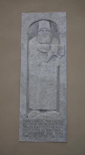 Keywords: Bad Staffelstein Rathaus 002.JPG Bad Staffelstein Aufschrift ADAM RIESE DER GROSSE DEUTSCHE RECHENMEISTER GEB ZU STAFFELSTEIN 1492 GESTORBEN ZU ANNABERG IM ERZGEBIRGE 1559 TAFEL ERRICHTET AM 10 MAI 1959 own Janericloebe 2010-05 Panoramafreiheit Bad Staffelstein Town Hall Adam Ries Reliefs in Upper Franconia Reliefs of german people Reliefs of men 20th-century reliefs |