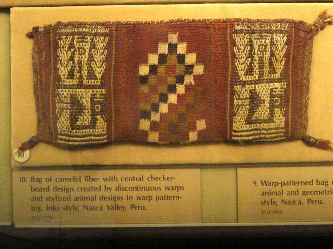 Keywords: Bag, camelid fiber, Inka style, Nasca Valley - DSC06120.JPG Exhibit in the South American collection of the American Museum of Natural History Manhattan New York City New York USA Photography was permitted in the museum without restriction Daderot 2012-04-02 11 53 29 Daderot cc0 cc0 Peruvian bags in the American Museum of Natural History |