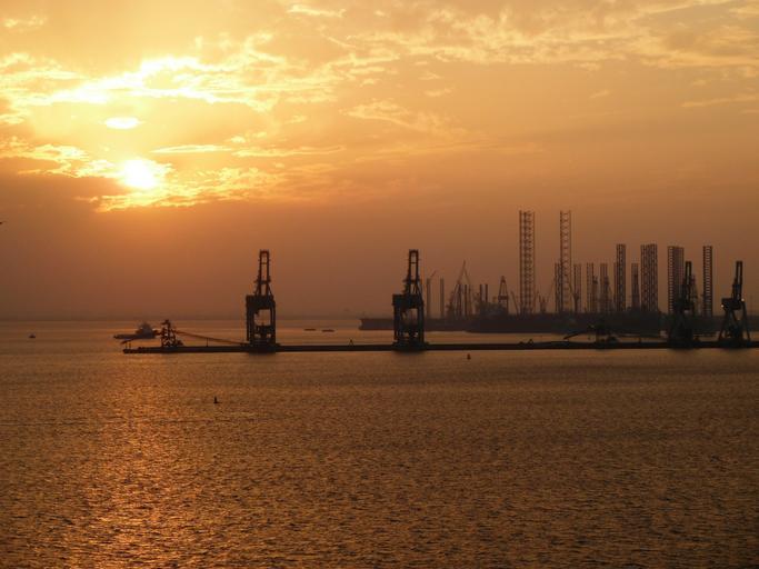 Keywords: bahrain sunset industry abendstimmung silhouette twilight mood evening sun afterglow