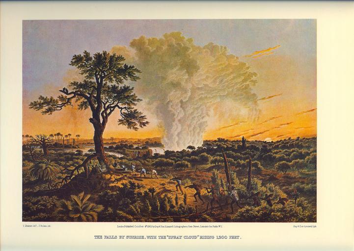 | Keywords: Baines Falls by Sunrise col print.jpg Title THE FALLS BY SUNRISE WITH THE 'SPRAY CLOUD' RISING 1 200 FEET <br> Additional text T Baines delt_T Picken lith London Published October 4th 1865 by Day Son Limited Lithographers Gate Street Lincoln's Inn Fields WC Day Son Limited Lith <br> Content Victoria Falls with party of travellers Europeans are setting up a camera sketching and frying breakfast Africans are carrying loads including ribs and haunches of meat Different types of dress can be seen the white men are wearing shirt trousers and brimmed hats; some of the black men wear loincloths others shirt and trousers and their headgear includes head cloths and fez-like hats Three figures are resting or asleep two wrapped in blankets Two birds vultures sit in the tree overhead Palm and baobab trees are visible in the distance scan of modern copy of colour print original publication 1865 uploaded to Commons 2006-09-21 Creator Thomas Baines PD-old See also Image Baines Herd of Buffaloes jpg Image Baines Falls from the East col print jpg Image Baines4 jpg Image Baines Gt Western Fall col print jpg Image Baines Zanjueelah jpg Thomas Baines Victoria Falls in art 1865 paintings 1860s landscape paintings Africans in 19th-century art Loincloths in art |