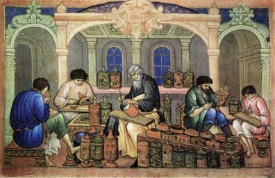 Keywords: BakanovPalekhKhokhloma.jpg en Khokhloma artists at work Palekh miniature by Ivan Mikhailovich Bakanov http //palekh narod ru/b/bakanov/bakim_10 jpg Иван Рихайлович Баканов/Ivan Mikhailovich Bakanov 1870-1936 1929 PD-Art Khokhloma Palekh Miniature |