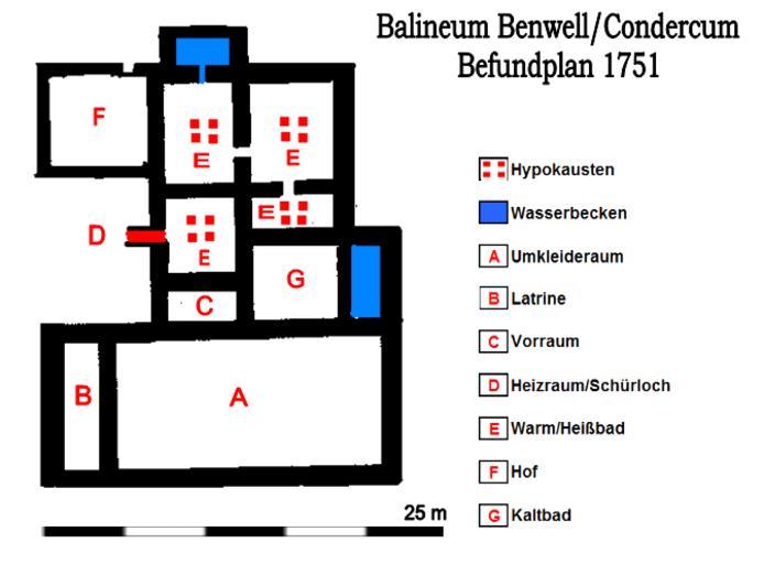 | Keywords: Balineum Benwell.png en Groundplan roman Bathouse in Benwell/Condercum 1751 de Grundriss des römischen Badehauses balineum von Benwell/Condercum GB Befunde von 1751 own Veleius 2016-01-09 Vorlage in John Collingwood-Bruce Handbook to the Roman Wall 12 Ausgabe 1966 S 54 Cc-zero Condercum Benwell |