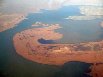 | Keywords: BalkhashPlaneTransaero.JPG  en The center of Balkhash Lake as seen from an airplane ru Полуост ов Са ыесик  азделяющий озе о Балхаш на две части и п олив Узына ал Ап ель 2006 года снимок сделан с бо та самолёта Алма-Ата - Домодедово авиакомпании Т ансаэ о Own Ds02006 2006-04 46 56 75 36 Geography of Kazakhstan Lake Balkhash |