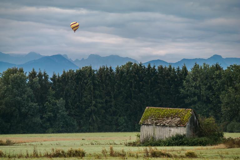 Keywords: balloon mountains sky clouds alpine hot air balloon fly air sports drive hot air balloon ride go balloon hut forest meadow pasture float upgrade colorful take off wind aircraft bavaria germany