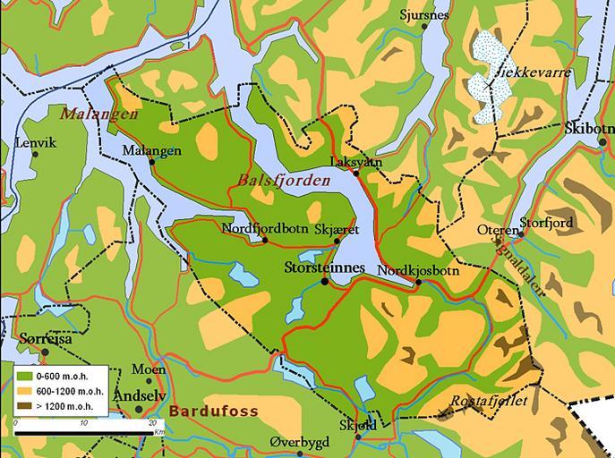 Keywords: Balsfjord map.jpg en Map of Balsfjord municipality Norway Own Jensens 2008-12-05 Maps of Troms Balsfjord