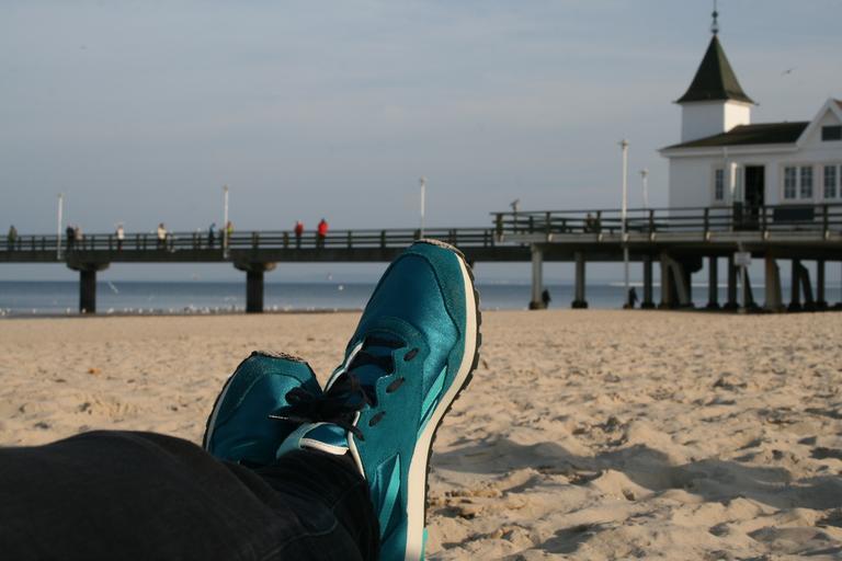 Keywords: baltic sea sea usedom ahlbeck emperor's bath kaiser baths beach sand coast water sea bridge sand beach sky shoes sneakers holiday nature