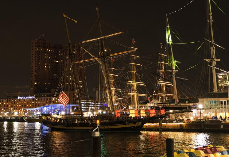 Keywords: baltimore night dusk city urban boat ship harbor inner harbor lights maryland building scenery landscape travel tourism architecture historic sails