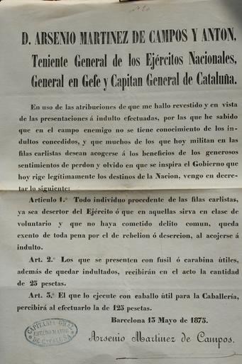 Keywords: Ban oferint l'indult als voluntaris carlins.jpg ca Ban del general Martínez Campos capità general de Catalunya oferint l'indult als carlins que es presentin amb armes o cavalls Va ser enviat a la majoria dels ajuntaments catalans a les acaballes de la tercera guerra carlina Està datat a Barcelona el 13 de maig de 1875 1875-05-13 http //xac gencat cat/web/ content/xac/01_continguts_arxius_comarcals/ac_valles_oriental/03_documents_escollits_acvo/imatges/fitxers/acvo_ban_guerra_1875 jpg General Martínez Campos capità general de Catalunya other versions PD-old-70-1923 Uploaded with UploadWizard 19th century Barcelona in the 1870s Europe in the 19th century Historical Documents of Catalonia |