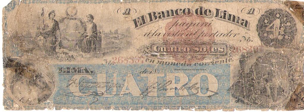 Keywords: Banco de Lima anv.jpg Billete de 4 soles de palta del Banco de Lima de 1870 extremadamente raro perteneciente a la coleección personal de Ernesto Linares From the Ernesto Linares's Collection Banknotes of Peru Banknotes with a face value of 4 |