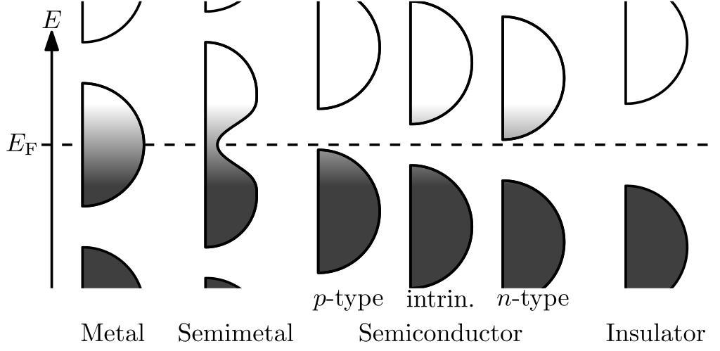 | Keywords: Band filling diagram.svg Band structure diagrams for metal etc Inspired by Kittel's Introduction to Solid State Physics 7th Edition chapter 7 2013-06-16 22 47 04 own Nanite Source code Made using Ipe Source code below also placed into public domain <source lang xml > < xml version 1 0 > < DOCTYPE ipe SYSTEM ipe dtd > <ipe version 70005 creator ipetoipe 7 1 2 > <info created D 20130511174826 modified D 20130526102608 /> <ipestyle name cust > <pen name heavier value 1 /> <color name gray value 0 5 /> <color name darkgray value 0 25 /> <color name lightgray value 0 75 /> <dashstyle name dashed value 4 0 /> <textsize name large value \large /> <textsize name Large value \Large /> <textsize name LARGE value \LARGE /> <textsize name huge value \huge /> <textsize name Huge value \Huge /> <textsize name small value \small /> <textsize name footnote value \footnotesize /> <textsize name tiny value \tiny /> <textstyle name center begin \begin center end \end center /> <textstyle name itemize begin \begin itemize end \end itemize /> <textstyle name item begin \begin itemize \item end \end itemize /> <gridsize name 4 pts value 4 /> <gridsize name 8 pts ~3 mm value 8 /> <gridsize name 16 pts ~6 mm value 16 /> <gridsize name 32 pts ~12 mm value 32 /> <gridsize name 10 pts ~3 5 mm value 10 /> <gridsize name 20 pts ~7 mm value 20 /> <gridsize name 14 pts ~5 mm value 14 /> <gridsize name 28 pts ~10 mm value 28 /> <gridsize name 56 pts ~20 mm value 56 /> <gridsize name 2 pts value 2 /> <anglesize name 90 deg value 90 /> <anglesize name 60 deg value 60 /> <anglesize name 45 deg value 45 /> <anglesize name 30 deg value 30 /> <anglesize name 22 5 deg value 22 5 /> <layout paper 280 136 origin 0 0 frame 280 136 /> <gradient name fermi type axial coords 0 64 0 96 extend yes > <stop offset 0 color 0 25 /> <stop offset 1 color 1 /> </gradient> <tiling name falling angle -60 step 4 width 1 /> <tiling name rising angle 30 step 4 width 1 /> </ipestyle> <page> <layer name alpha /> <layer name BBOX /> <view layers alpha active alpha /> <path layer alpha stroke black dash dashed pen heavier > 16 80 m 280 80 l </path> <text matrix 1 0 0 1 -154 248 -666 815 transformations translations pos 198 026 670 189 stroke black type label halign center valign baseline >Metal</text> <text matrix 1 0 0 1 -106 248 -666 815 transformations translations pos 198 026 670 189 stroke black type label halign center valign baseline >Semimetal</text> <text matrix 1 0 0 1 -26 248 -666 815 transformations translations pos 198 026 670 189 stroke black type label halign center valign baseline >Semiconductor</text> <text matrix 1 0 0 1 57 752 -666 815 transformations translations pos 198 026 670 189 stroke black type label halign center valign baseline >Insulator</text> <text matrix 1 0 0 1 -150 -658 464 transformations translations pos 152 736 stroke black type label valign baseline > E_ \rm F </text> <text matrix 1 0 0 1 -62 248 -646 815 transformations translations pos 198 026 670 189 stroke black type label halign center valign top > p -type</text> <path layer BBOX stroke black > 0 0 m 0 136 l 280 136 l 280 0 l h </path> <path layer alpha matrix 1 0 0 1 0 -4 stroke black pen heavier rarrow normal/normal > 20 128 m 20 28 l </path> <text matrix 1 0 0 1 -136 -610 464 transformations translations pos 152 736 stroke black type label valign baseline > E </text> <text matrix 1 0 0 1 9 752 -646 815 transformations translations pos 198 026 670 189 stroke black type label halign center valign top > n -type</text> <text matrix 1 0 0 1 -26 248 -646 815 transformations translations pos 198 026 670 189 stroke black type label halign center valign top >intrin </text> <group clip 28 136 m 28 24 l 272 24 l 272 136 l h > <path stroke black fill 1 pen heavier gradient fermi > 32 56 m -24 0 0 -24 32 80 56 80 a -24 0 0 -24 32 80 32 104 a h </path> <path matrix 1 0 0 1 16 0 stroke black fill 1 pen heavier gradient fermi > 84 100 m -20 0 0 -20 64 100 64 120 a 64 80 l 64 40 l -20 0 0 -20 64 60 84 60 a 84 68 68 76 68 84 84 92 84 100 s h </path> <path matrix 1 0 0 1 48 76 stroke black fill white pen heavier > 32 56 m -24 0 0 -24 32 80 56 80 a -24 0 0 -24 32 80 32 104 a h </path> <path matrix 1 0 0 1 48 -76 stroke black fill darkgray pen heavier > 32 56 m -24 0 0 -24 32 80 56 80 a -24 0 0 -24 32 80 32 104 a h </path> <path stroke black fill white pen heavier > 32 120 m -24 0 0 -24 32 144 56 144 a -24 0 0 -24 32 144 32 168 a h </path> <path stroke black fill darkgray pen heavier > 32 -8 m -24 0 0 -24 32 16 56 16 a -24 0 0 -24 32 16 32 40 a h </path> <path stroke black fill 1 pen heavier gradient fermi > 124 30 m -24 0 0 -24 124 54 148 54 a -24 0 0 -24 124 54 124 78 a h </path> <path stroke black fill 1 pen heavier gradient fermi > 124 94 m -24 0 0 -24 124 118 148 118 a -24 0 0 -24 124 118 124 142 a h </path> <path stroke black fill 1 pen heavier gradient fermi > 160 24 m -24 0 0 -24 160 48 184 48 a -24 0 0 -24 160 48 160 72 a h </path> <path stroke black fill 1 pen heavier gradient fermi > 160 88 m -24 0 0 -24 160 112 184 112 a -24 0 0 -24 160 112 160 136 a h </path> <path stroke black fill 1 pen heavier gradient fermi > 196 18 m -24 0 0 -24 196 42 220 42 a -24 0 0 -24 196 42 196 66 a h </path> <path stroke black fill 1 pen heavier gradient fermi > 196 82 m -24 0 0 -24 196 106 220 106 a -24 0 0 -24 196 106 196 130 a h </path> <path stroke black fill white pen heavier > 244 96 m -24 0 0 -24 244 120 268 120 a -24 0 0 -24 244 120 244 144 a h </path> <path stroke black fill darkgray pen heavier > 244 16 m -24 0 0 -24 244 40 268 40 a -24 0 0 -24 244 40 244 64 a h </path> </group> </page> </ipe> </source> cc-zero Uploaded with UploadWizard Bandgap comparisons Fermi-Dirac distribution |