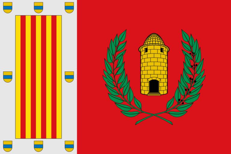 | Keywords: Bandera de Caudiel.svg Caudiel Alt Palà ncia PaÃs Valencià Bandera de proporcions 2 3 Tercejada a l ™asta el primer terç junt a l ™asta en camp d ™or quatre pals de gules amb una bordura d ™argent carregada amb huit escudets d ™or amb una faixa d ™atzur Al segon en camp de gules una torre d ™or de planta redona amb cúpula del mateix metall aclarida i maçonada de sable acostada de dues branques de llorer de sinople la sinistra fruitada de sable RESOLUCIÓ de 27 de gener de 2009 del vicepresident primer conseller de Presidència DOGV num 5954<ref>https //www docv gva es/portal/portal/2009/02/13/pdf/2009_1308 pdf DOGV num 5954</ref> own Mutxamel 2010-06-17 <references /> Caudiel Flags of municipalities of the province of Castellón |