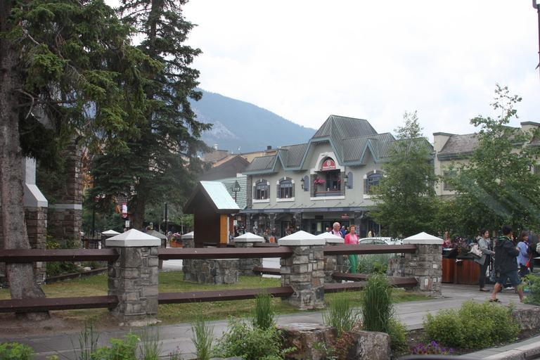 Keywords: banff town canada street destination stone park national canadian flowers travel world . intersection european traffic avenue summer outside building bike balcony season unesco shopping heritage chalet architecture
