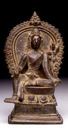 Keywords: Bangladeshi - Bodhisattva Avalokiteshvara - Walters 543006 - View A.jpg Lightly clad and sparsely ornamented the ascetic bodhisattva is seated in the graceful lalitasana on a lotus with a prominent calyx and broad petals placed atop a plain rectangular base with molding at the bottom His right foot rests laterally on a ledge with beaded edge projecting from the base The slim figure has a long oval face with large staring eyes shaded by peaked brows Long braids of hair frame the face and a fan-shaped crest on top adds a decorative touch His extended right hand holds a jewel and the left grasps a stem carrying a flower with a cluster of leaves probably representing the blue lotus century 9 bronze cm 13 accession number 54 3006 25184 John and Berthe Ford Baltimore date and mode of acquisition unknown Walters Art Museum John Berthe Ford 2002 Desire and Devotion Art from India Nepal and Tibet in the John and Berthe Ford Collection The Walters Art Museum Baltimore; Birmingham Museum of Art Birmingham; Santa Barbara Museum of Art Santa Barbara; Albuquerque Museum Albuquerque 2001-2003 place of origin Bangladesh Walters Art Museum license Buddhist art in the Walters Art Museum Art of Bangladesh Media contributed by the Walters Art Museum needs category review Braids in art Bodhisattva statues