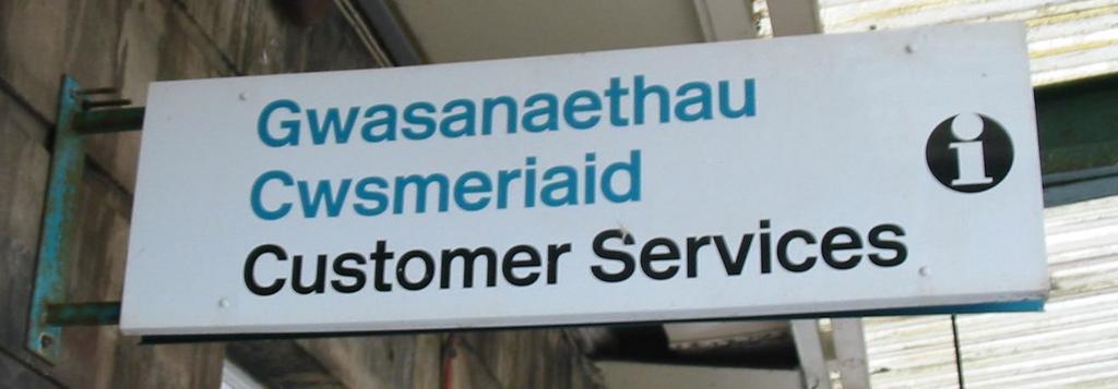 Keywords: Bangor bilingual station customer sign.jpg Welsh language Own 2007-12-01 Man vyi Own work all rights released Public domain Bilingual signs in Wales Bangor Gwynedd railway station