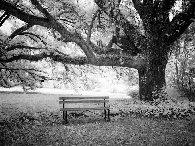 Keywords: bank park bench tree meadow rest harmony recovery garden seat park green old bench forest resting place relax tranquility base sw black and white infra red alabama usa monroeville america united states north america carol m highsmith