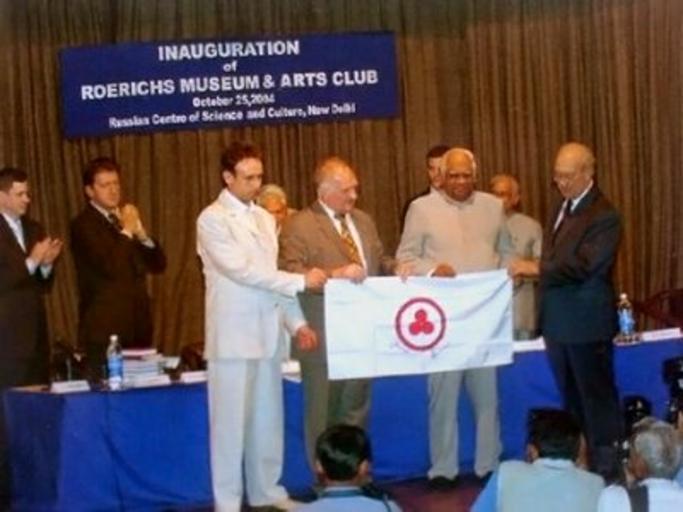 | Keywords: Banner of Peace India.jpg В учение Знамени и а побывавшего на бо ту космической станции и спике у Па ламента Индии Ш и Сомнатх Чатте джи по случаю 100-летия С Ре иха Слева нап аво С Залетин В Афанасьев Ш и Сомнатх Чатте джи Ю Во онцов Own 25 октяб я Deodar Banner of Peace Photographs of flags 25 October |