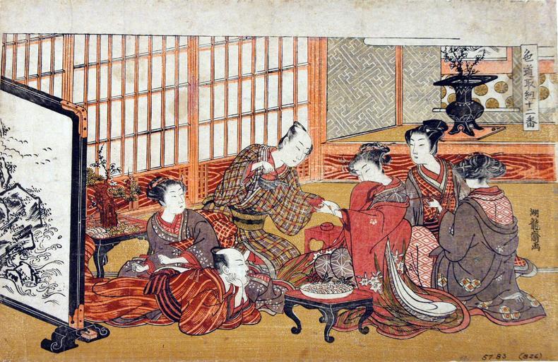 Keywords: Banquet in a wealthy household (5758877457).jpg en <b>Accession Number </b> 1957 83 <b>Display Artist </b> Isoda Koryusai <b>Display Title </b> Banquet in a wealthy household <b>Series Title </b> Shikido torikumi juniban Twelve Bouts in the Way of Love <b>Suite Name </b> Shikido torikumi juniban <b>Creation Date </b> 1770-1774 <b>Medium </b> Woodblock <b>Height </b> 9 7/8 in <b>Width </b> 15 1/4 in <b>Display Dimensions </b> 9 7/8 in x 15 1/4 in 25 08 cm x 38 74 cm <b>Credit Line </b> Bequest of Mrs Cora Timken Burnett <b>Label Copy </b> This early full-color print was the cover of an erotic album The kinds of flowers and food and drink indicate that the time of year is New Year The scene takes place in a brothel where two men are selecting the courtesans with whom they will celebrate the New Year <b>Label Copy Spanish </b> Este grabado a todo color fue la portada de un lbum ertico El tipo de flores comida y bebida indica que es poca de Ao Nuevo La escena se lleva a cabo en un burdel donde dos hombres seleccionan a las cortesanas con las cuales celebrarn el Ao Nuevo <b>Collection </b> <a href http //www sdmart org/art/our-collection/asian-art rel nofollow >The San Diego Museum of Art</a> 2007-05-09 14 54 53 https //www flickr com/photos/thesandiegomuseumofartcollection/5758877457/ Flickr en thesandiegomuseumofartcollection PD-old-100 Files from the San Diego Museum of Art to be checked