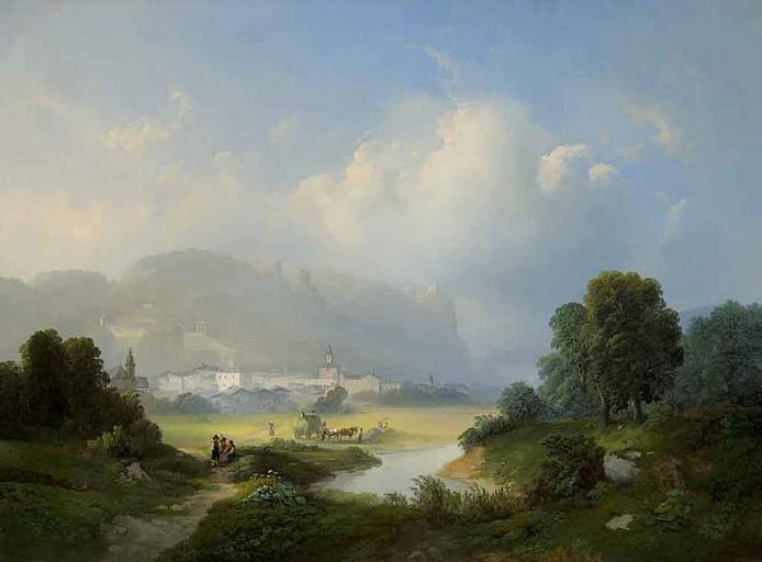 | Keywords: Barbarini Ansicht von Hallein.jpg Ansicht von Hallein Salzburg 1865 oil on canvas Salzburg Museum Inv -Nr 1035/2007 object history provenanceEvent 2007 purchase Salzburger Museumsverein Salzburg Museum http //www salzburgmuseum at/ 1865 creator Franz Barbarini Paintings in the Salzburg Museum 1865 paintings Landscape paintings of Austria Hallein in art Franz Barbarini Barmsteine Views of Hallein PD-old-100 | ||||