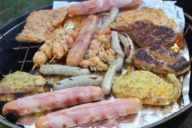 Keywords: barbecue steaks sausages meat grilled food tasty summer bbq sausage delicious grill celebration charcoal party stainless eat ham herb butter