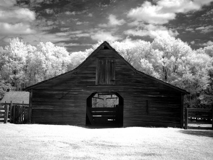 Keywords: barn stadl agriculture rural nature grass landscape meadow fields log cabin hut montana usa america united states farm sw infra red black and white black white dothan alabama landmark park