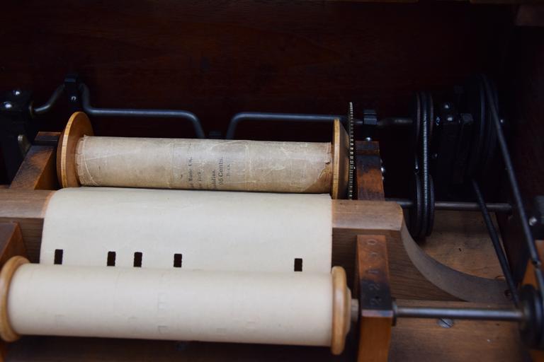 Keywords: barrel organ street organ mechanics music wood piano roll sound redirection old antique detail