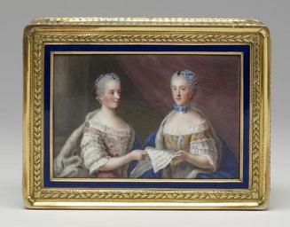 Keywords: Barriere - Snuffbox with the Family of Louis XV - Walters 57136 - Bottom.jpg The box is decorated with images of the children of Louis XV and Queen Marie Leszczynska Louise-Elizabeth and Marie-Adelaide on the cover ; Victoire-Louise and Sophie-Philippine on the base ; Louis the dauphin with a kite on the front ; Louise-Marie holding a battledore and shuttlecock for a racquet game on the left end ; and Philippe duke of Anjou blowing bubbles on the right end As Philippe died in 1733 the images must be based on earlier portraits between 1761 1762 gold painted enamel cm 5 6 3 accession number 57 136 22517 ZoƩ Victoire Talon Comtesse du Cayla 1785-1852 Paris Maurice Kann Paris Charles J Wertheimer Sale Christie's London May 9 1912 no 14 Jacques Seligmann Paris by purchase Henry Walters Baltimore after 1912 by purchase Walters Art Museum Henry Walters Acquired by Henry Walters after 1912 Objects of Vertu Precious Works of the Eighteenth Century The Walters Art Gallery Baltimore 1984 Vive la France French Treasures from the Middle Ages to Monet The Walters Art Gallery Baltimore 1999-2000 place of origin France Walters Art Museum license Barriere Jeweller J J Dailly Snuffboxs in the Walters Art Museum Portrait miniatures in the Walters Art Museum 18th-century portrait paintings in the Walters Art Museum 1761c House of Bourbon 1761c Princess Victoire of France 1761c Sophie de France 1734-1782 1761c 18th-century family portraits of royalty 1761c 18th-century portrait paintings of women at half length 1761c Females with chokers in art 1761c Lace sleeves in art 1761c Portraits of sisters 1761c Portraits with musical scores 1761c Vive la France French Treasures from the Middle Ages to Monet |