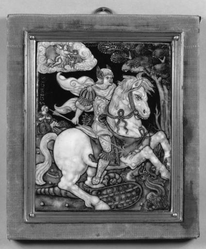 | Keywords: Barthélemy Texier - Plaque with Saint George - Walters 4463.jpg The saint wearing pseudo-classical armor decorated with scrolls a winged helmet and embroidered buskins his flying mantle clasped on the right shoulder with a round fibula rides a white horse which rears toward the right Beneath its feet lies the dragon which he has vanquished with his spear A quiver of arrows is slung at his belt To the left in the background kneels Princess Sabrina Above her in the clouds an angel holds a shield charged with the arms of the saint These should be argent a cross gules but the enameller has transcribed them as azure a cross argent The inscription S GEORGES is lettered vertically on the background at the extreme left At the right rises a tree 2nd quarter 16th century Early Modern technique painted enamel copper cm 14 3 11 8 accession number 44 63 7489 Frédéric Spitzer Collection Paris by purchase no 83 Sale Paul Chevallier and Charles Mannheim Paris April 17 1893 no 499 Charles Borradaile Collection Brighton date of acquisition unknown by purchase George Robinson Harding London date of acquisition unknown by purchase Henry Walters Baltimore date of acquisition unknown by purchase Walters Art Museum Henry Walters Acquired by Henry Walters place of origin Limoges France Walters Art Museum license Limoges painted enamels in the Walters Art Museum Barthélemy Texier Painted enamel art in the Walters Art Museum Spitzer Collection |