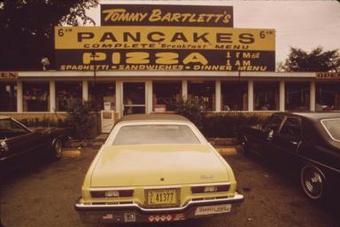 Keywords: BartlettsPancakesWisconsin.jpg Tommy Bartlett's pancake and pizza restaurant Wisconsin 1973 Exterior view with signage promoting Pancakes Pizza Spaghetti Sandwiches Dinner Menu In front of the door a yellow w Oldsmobile with 1972 Iowa license plate 31 41377 is parked in the foreground This apparently was in Lake Dalton Wisconsin and later torn down and the site used for Tommy Bartlett's House of Tomorrow NEAR THE TOWN OF WISCONSIN DELLS THE WISCONSIN RIVER CHANNELS THROUGH DEEP SOFT SANDSTONE CLIFFS CUTTING THE ROCK INTO FANTASTIC SHAPES THESE NATURAL SPLENDORS HAVE GIVEN RISE TO A BOOMING TOURIST INDUSTRY PEOPLE COME IN DROVES OFTEN IN CAMPERS AND TRAILERS BOAT TRIPS SHOPS BARS AND DIVERSIONS OF EVERY KIND VIE FOR PATRONAGE IN AN AMUSEMENT COMPLEX EXTENDING 2 OR 3 MILES BEYOND THE TOWN 09/1973 Photograph by Jonas Dovydenas for Series DOCUMERICA The Environmental Protection Agency's Program to Photographically Document Subjects of Environmental Concern compiled 1972 - 1977 NARA-image 554188 Old version converted from gif to jpg and border cropped before upload New version lossless crop from File NEAR THE TOWN OF WISCONSIN DELLS THE WISCONSIN RIVER CHANNELS THROUGH DEEP SOFT SANDSTONE CLIFFS CUTTING THE ROCK - NARA - 554188 jpg 1973-09 Jonas Dovydenas No restrictions PD-USGov <gallery> File NEAR THE TOWN OF WISCONSIN DELLS THE WISCONSIN RIVER CHANNELS THROUGH DEEP SOFT SANDSTONE CLIFFS CUTTING THE ROCK - NARA - 554188 jpg uncropped JPEG from NARA File NEAR THE TOWN OF WISCONSIN DELLS THE WISCONSIN RIVER CHANNELS THROUGH DEEP SOFT SANDSTONE CLIFFS CUTTING THE ROCK - NARA - 554188 tif uncropped TIFF from NARA </gallery> location possible 1972 license plates September 1973 in the United States 1973 in Wisconsin Automobiles in Wisconsin Black on yellow license plates Color reversal Jonas Dovydenas Lake Delton Wisconsin License plates of Iowa Oldsmobile Omega X-body RWD Restaurant signs in the United States Pancakes of the United States Pizzerias in Wisconsin Tommy Bartlett Signs in Wisconsin U S Route 12 in Wisconsin Wisconsin Highway 23 Yellow automobiles |