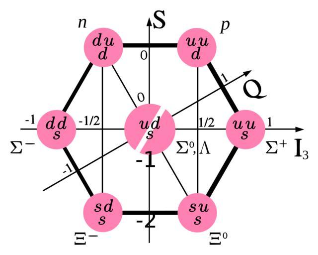 | Keywords: Baryon-octet.svg Premier octet de baryons own 2007-12-20 Trassiorf Trassiorf Image Baryon-octet-small svg The image Baryon-octet-small svg is 20 smaller in dimensions fr Le titre de cette figure est erroné elle représente le premier nonet de baryons Voir Physique des particules Ceci représente le premier octet de baryons regroupés selon le schéma SU 3 « La voie octuple » Sur cette figure reprenant la disposition conventionnelle I<sub>3</sub> est l'axe de la composante d'isospin Q est l'axe de la charge électrique S est l'axe de l'étrangeté « strangeness » Le contenu principal des particules en quarks est noté dans les cercles roses Le cercle rose coupé en deux représente les deux baryons notés en regard Ils se distinguent par diverses propriétés notamment la masse qui ne figurent pas sur ce diagramme en The title of this figure is wrong it represents the first baryon nonet See also en Quark model This shows the first baryon octet grouped according to the SU 3 scheme « Eightfold way » On this figure in the standard layout I<sub>3</sub> is the isospin component axis Q is the electric charge axis S is the strangeness axis The main quark content is indicated within the pink circles The pink circle split in 2 represents the 2 baryons indicated besides They are distinct by several properties notably their mass which are not represented on this diagram de Der Name dieser Abbildung ist falsch sie zeigt das erste Baryon Nonet Siehe auch de Bild Baryonoktett svg welche den gleichen Fehler aufweist Die Abbildung zeigt das erste Baryon Oktett gemäß dem SU 3 Schema Der achtfache Weg in Standarddarstellung I<sub>3</sub> ist die Achse der Isospin Komponente Q ist die Achse der elektrischen Ladung S ist die Strangeness-Achse Der Quarkinhalt wird in den rosa Kreisen gezeigt Der geteilte Kreis zeigt die zwei daneben genannten Baryonen Sie unterscheiden sich in einigen Eigenschaften insbesondere ihrer Masse die nicht in dieser Abbildung dargestellt sind Baryon multiplets |