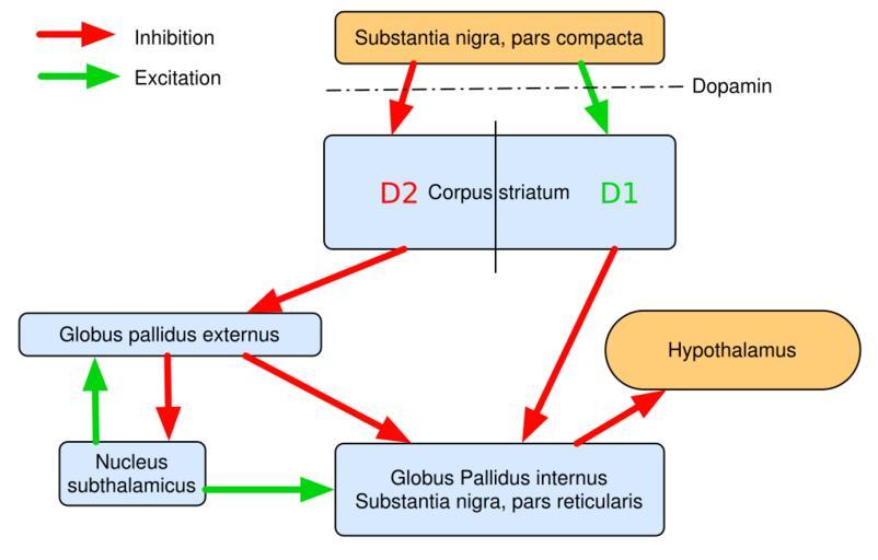 | Keywords: Basalganglia.svg Schematic presentation of the internal excitatory and inhibitory pathways in the basal ganglia Can be used to explain Parkinson's and Huntington's disease Author Sigve Holmen Neuroanatomy SVG files on Parkinson's disease Huntington's disease 2007-01-09 own assumed Sigve |