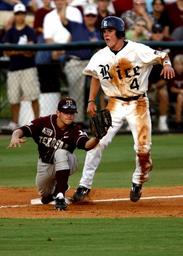 Keywords: baseball player third base runner tag play uniform sport athlete game baseball player grass action american glove third baseman competitive competition college infield