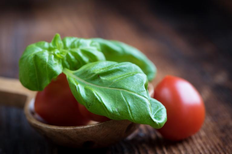 Keywords: basil green spice plant herbs food eat frisch healthy leaves kitchen spice nutrition vegetarian culinary herbs herb garden mediterranean ocimum basilicum ocimum flavourings tasty aroma tomato red vegetables vegan close food-photography