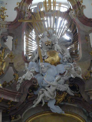 Keywords: Basilika Vierzehnheiligen 011.JPG Die Basilika Vierzehnheiligen bei Bad Staffelstein im Landkreis Lichtenfels ist eine Wallfahrtskirchen in Oberfranken <br>Decorations above the main altar Basilica of the Fourteen Holy Helpers Bad Staffelstein near Bamberg in Bavaria Germany Own Mattana 2009-04-16 Images by Mattana-Bamberg Germany Baroque altars in Basilika Vierzehnheiligen Statues of the Holy Trinity |