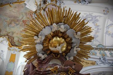 Keywords: Basilika Vierzehnheiligen 028.JPG Die Basilika Vierzehnheiligen bei Bad Staffelstein im Landkreis Lichtenfels ist eine Wallfahrtskirchen in Oberfranken <br>The decorations underneath the sounding board above the pulpit Basilica of the Fourteen Holy Helpers Bad Staffelstein near Bamberg in Bavaria Germany Own Mattana 2012-06-07 Images by Mattana-Bamberg Germany Vierzehnheiligen pulpit Abat-voix in Bavaria Sculptures of the Holy Spirit as a dove |