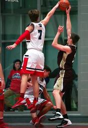 Keywords: basketball basketball game blocked shot block jump team high school athlete shot ball hand indoor competition action sport play male teenager
